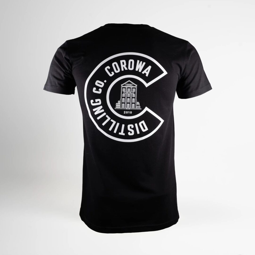 A soft cotton black tee featuring the Corowa Distilling Co. logo on front and back.